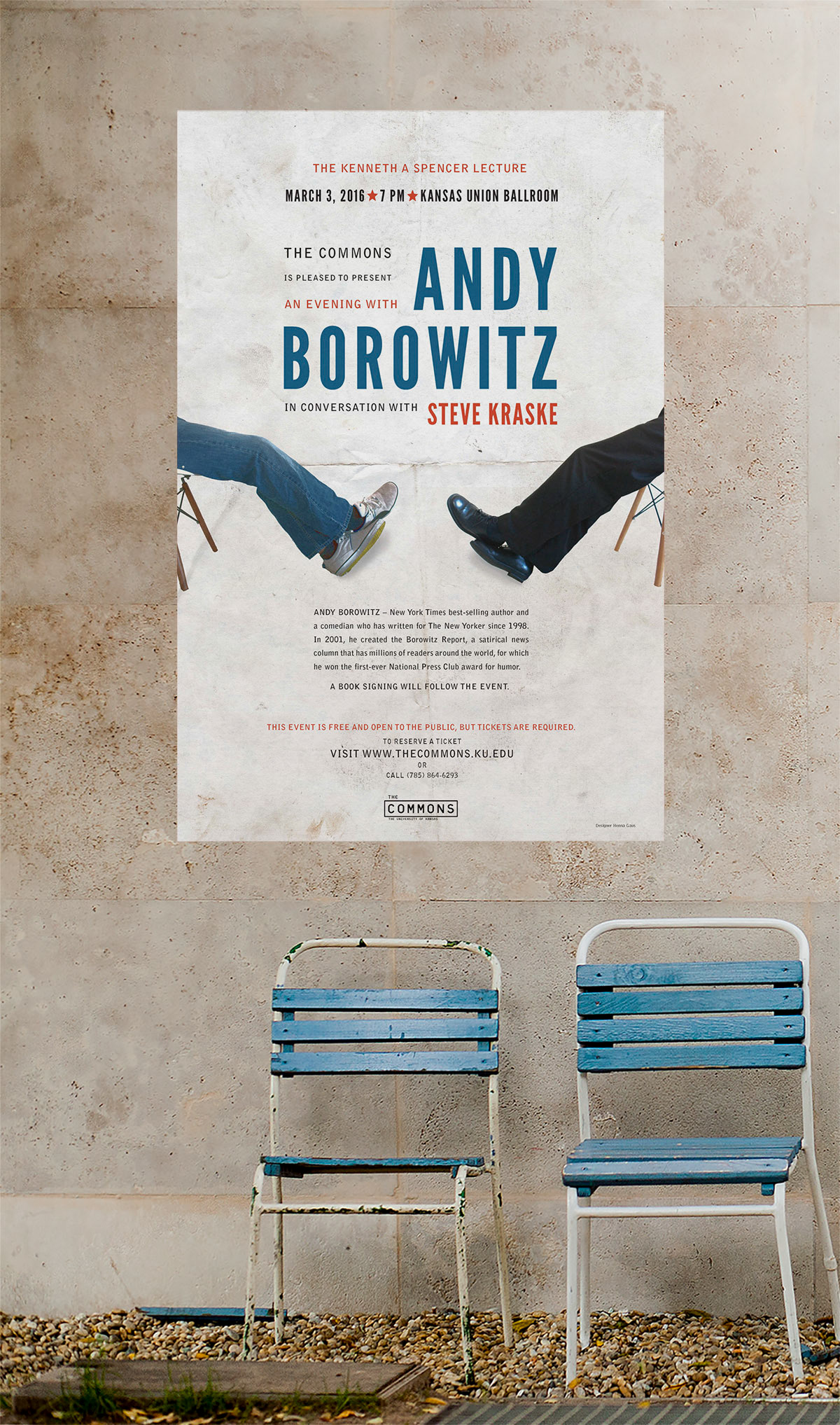 Andy Borowitz, a New York Times Bestselling author, satirist and comedian, visited University of Kansas in March 2016 as a guest for The Commons event, An Evening with Andy Borowitz. The poster and ad design were used for their official event advertising campaign.